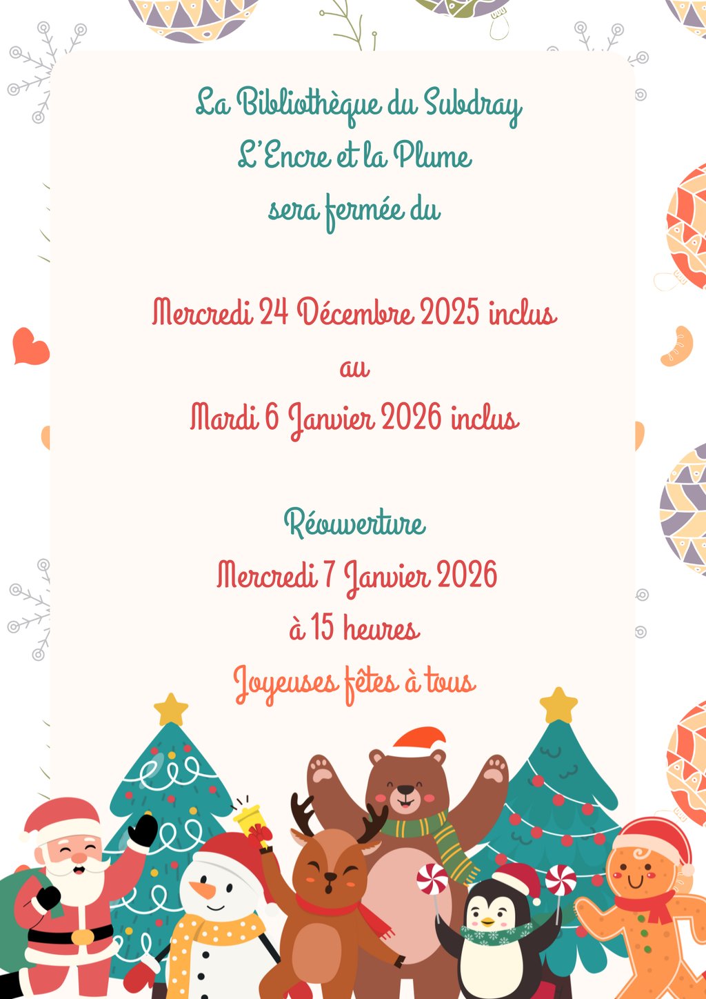 La bibliothèque "L'Encre et la Plume" sera fermée du mercredi 24 décembre au mardi 6 janvier inclus.