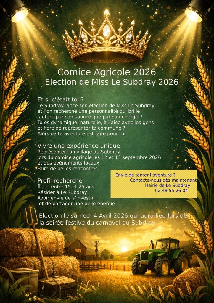 Appel à candidatures concernant l'élection de Miss Le Subdray qui aura lieu à l'occasion du Comice Agricole 2026.