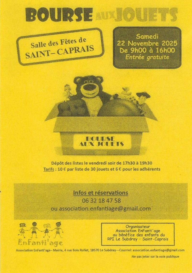La Bourse aux Jouets organisée par l'association EnFanti'age au bénéfice des enfants du RPI Le Subdray - St Caprais se déroulera dans la salle des fêtes de St Caprais le samedi 22 novembre 2025 de 9h à 16h.